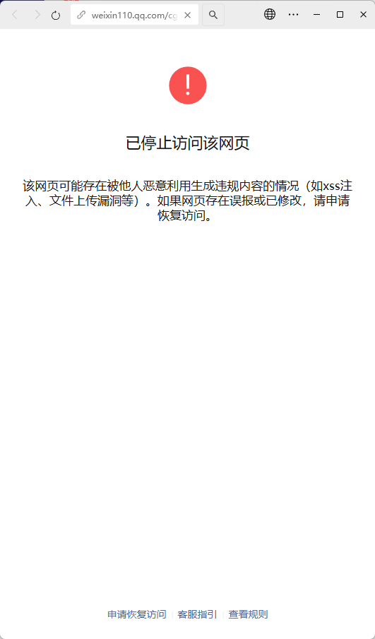 打开该域名链接时,出现“该网页可能存在被他人恶意利用生成违规内容的情况(如xss注入、文件上传漏洞等)。如果网页存在误报或已修改,请申请恢复访问。”提示。经全面自查: