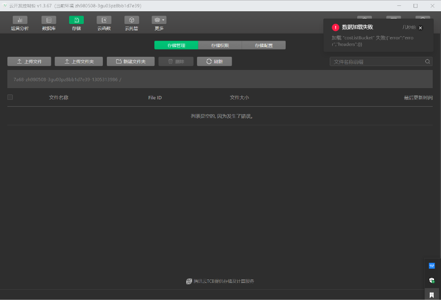 我每次打开云存储都会报这个错,重新登陆、重装开发者工具都试了,还是没办法加载列表