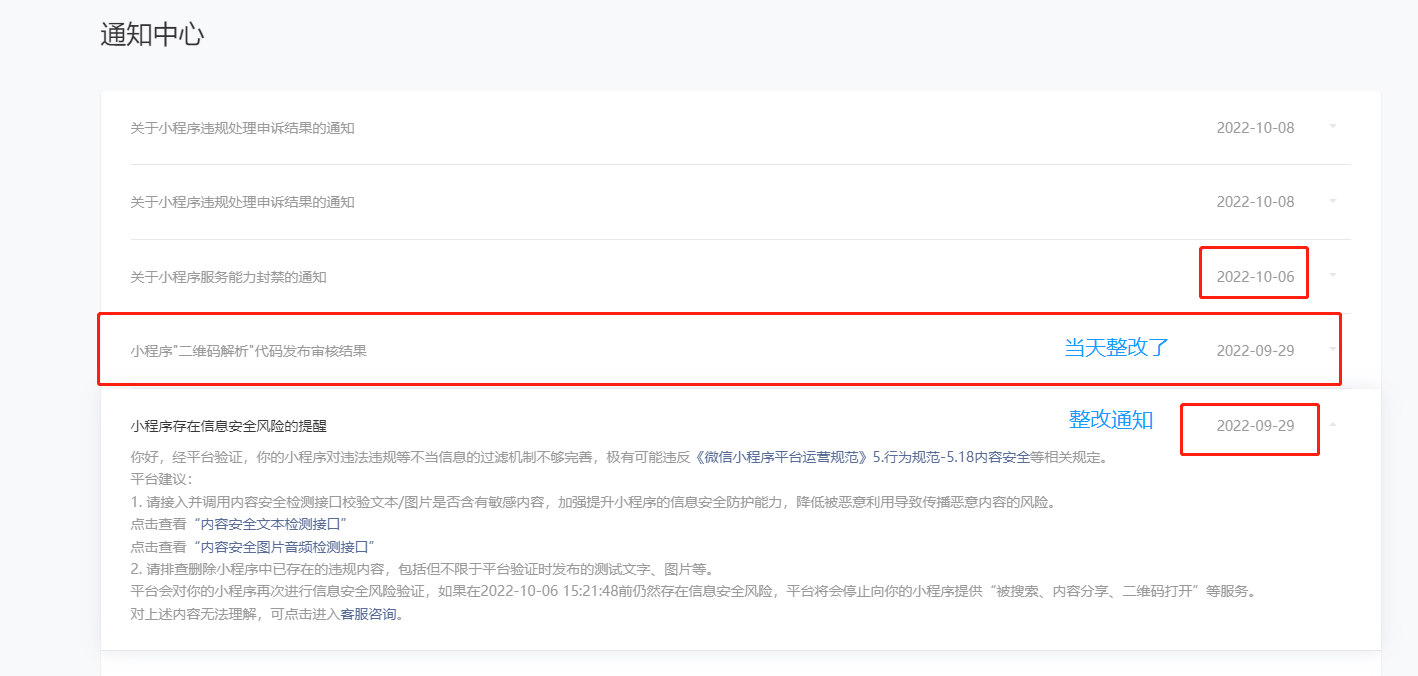 收到通知当天立即整改了,但是发布更新代码审核通过的时候我下班了,忘记发布了。