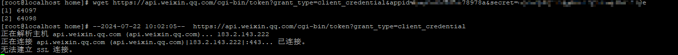 [root@localhost home]# --2024-07-22 09:58:30-- https://api.weixin.qq.com/cgi-bin/token?grant_type=client_credential