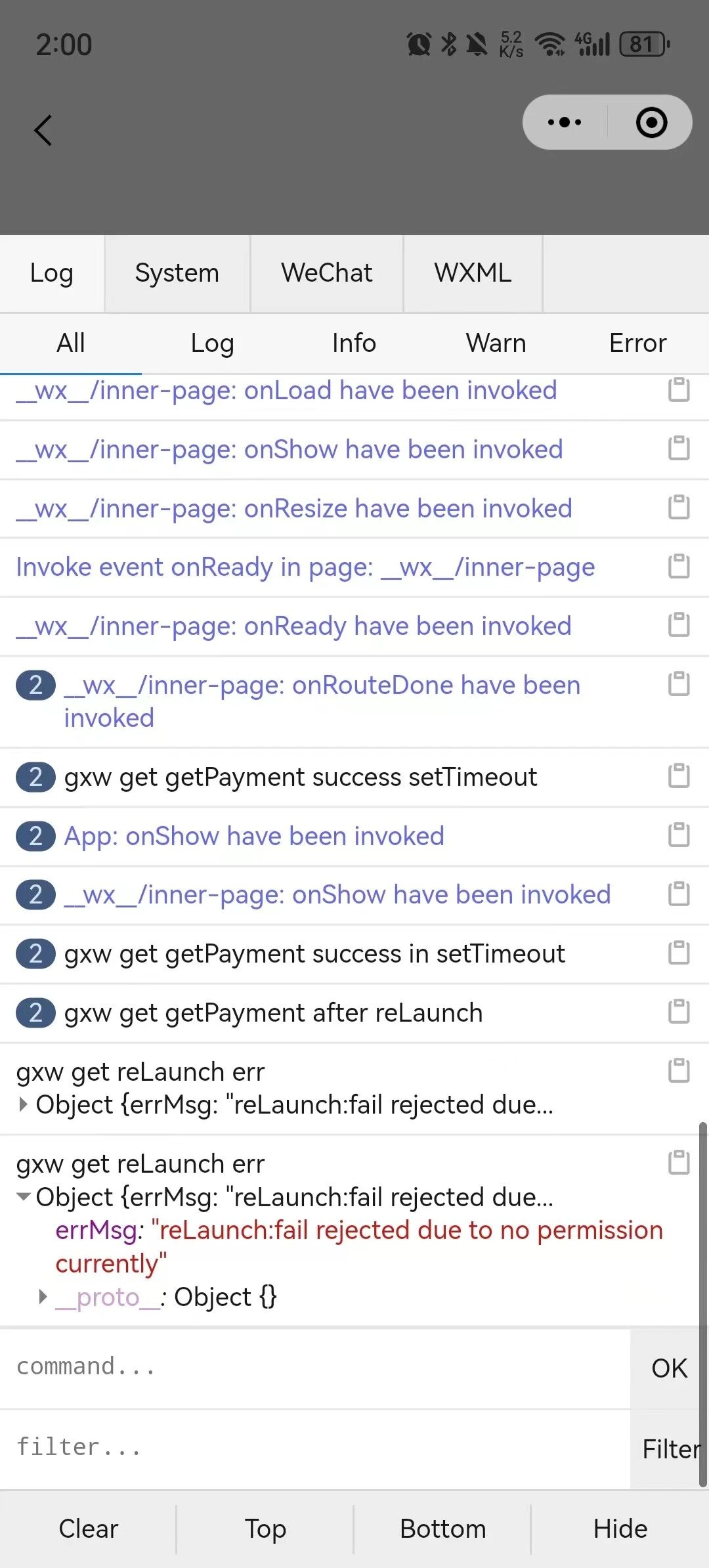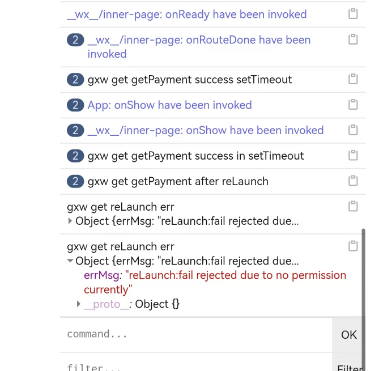 补充一下其他调试,在回调里面使用 wx.showModal、wx.redirectTo、wx.navigateTo等 在fail 里面都报 xxx:fail rejected due to no permission cuurently