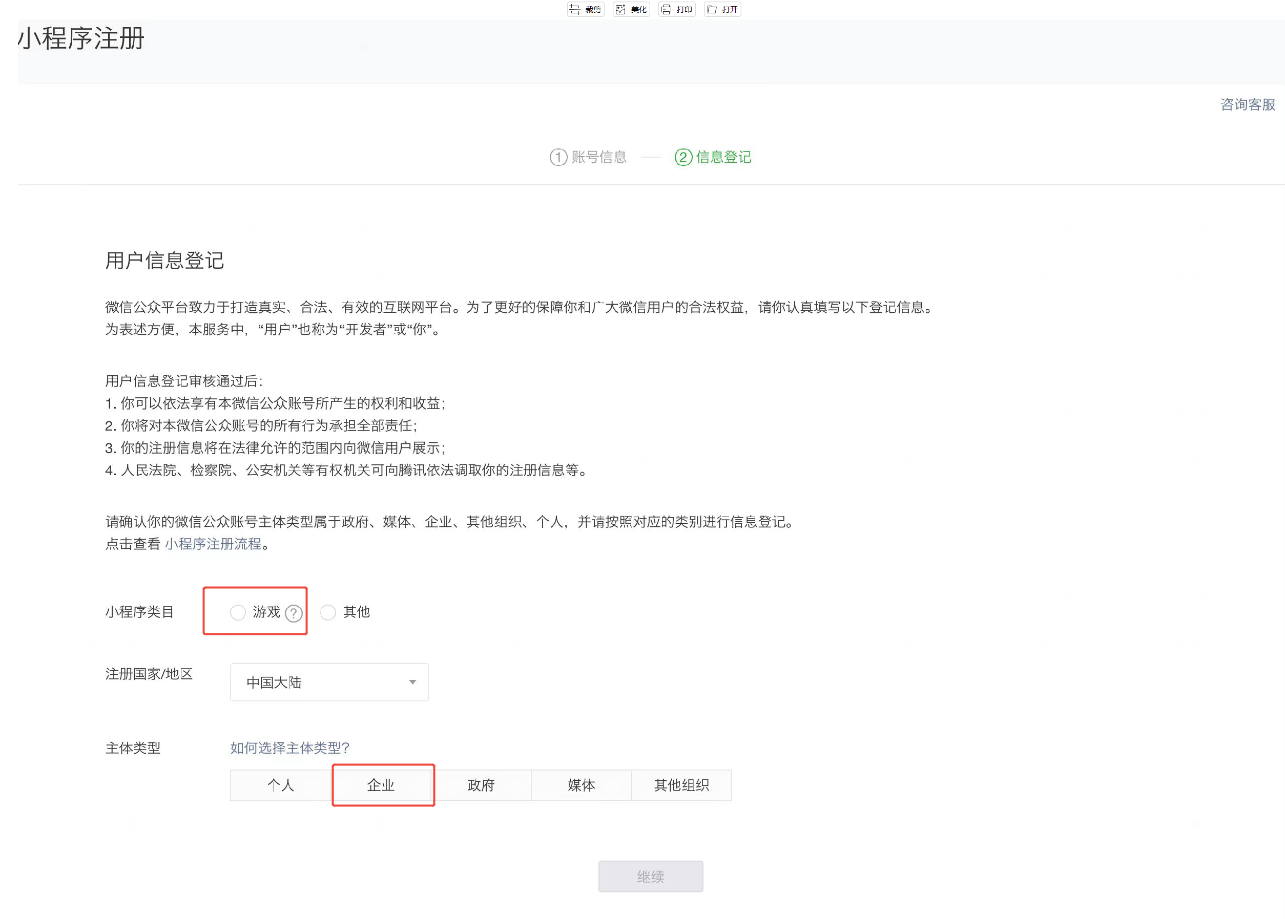 ● 小程序类目需选择“游戏”,公司请记得选择企业->企业类型