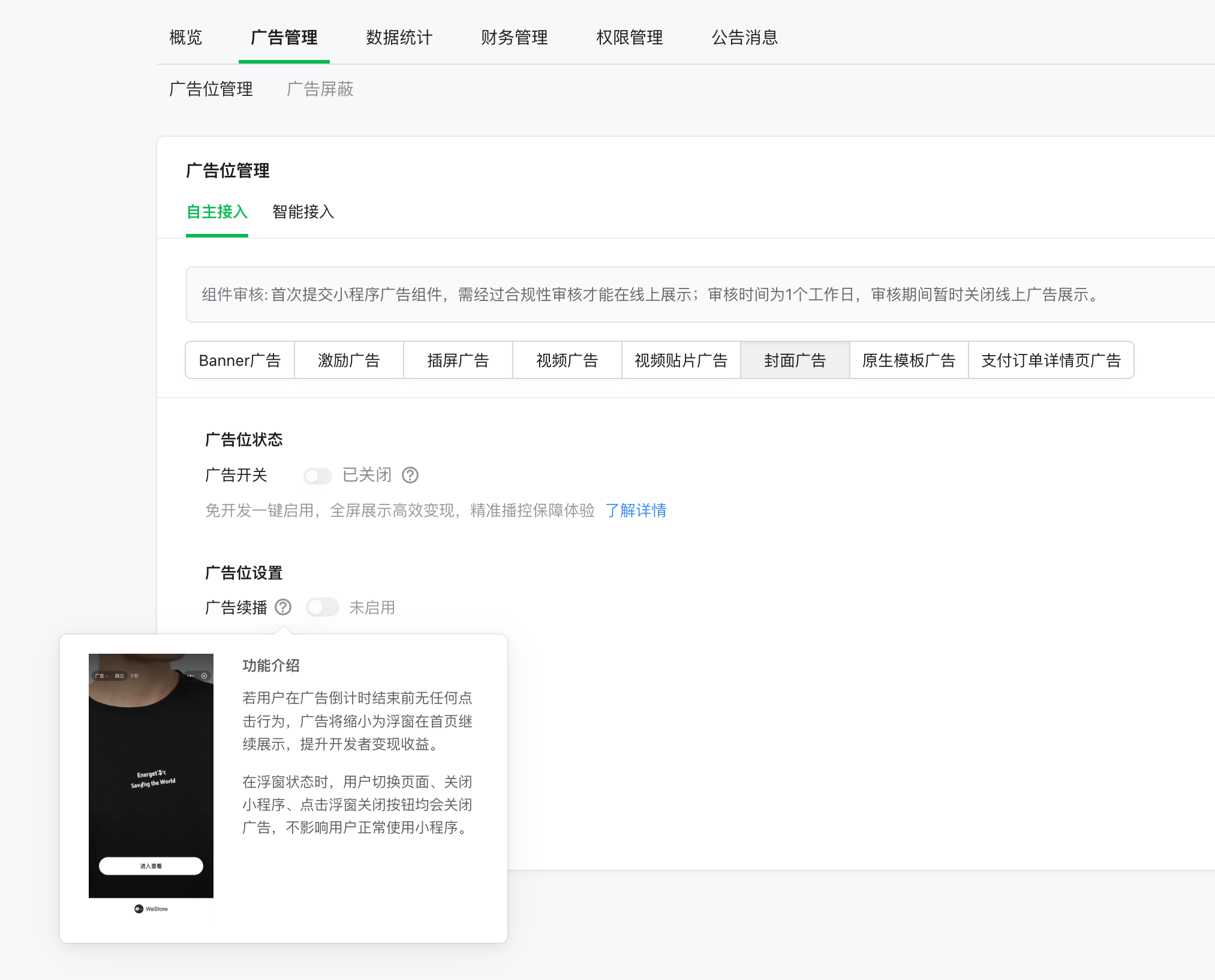 目前小程序的封面广告是有“广告续播”的开关,如图: