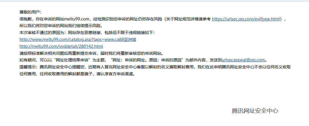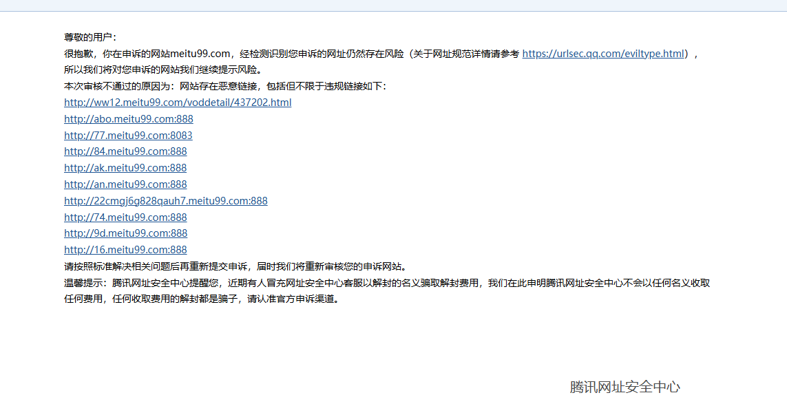 你好,经核实,域名meitu99.com手机管家拦截,此处只处理被微信暂停提供微信内直接访问的服务的外部链接的申诉问题,建议登录手机管家官网【http://gj.qq.com/online_server/complain_url.html】自行申诉,知悉。