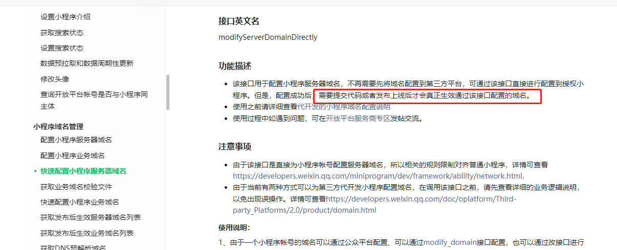 调用了commit接口提交代码。然后调用modify_domain_directly设置了request域名。权限18已授权。但是进入公众后台看request域名还是空的。请问这个modify_domain_directly什么情况下会生效。接口说明说,提交代码或发布生效。但是公众平台小程序request查看一直是空白。麻烦解惑,感激感谢。
