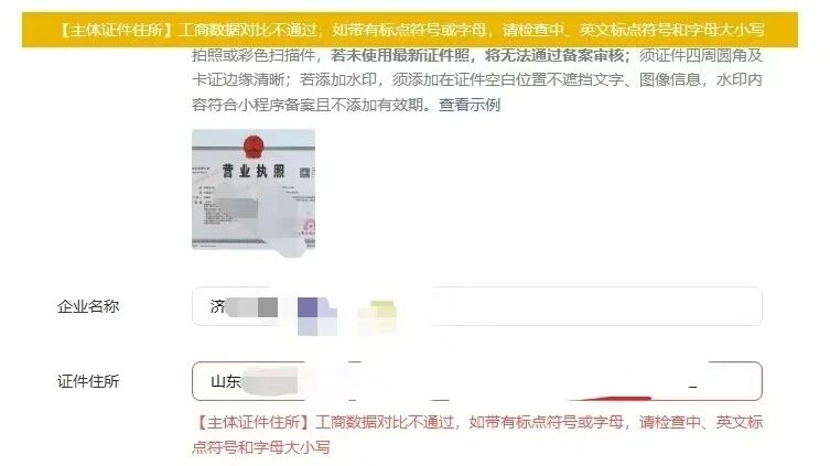 输入新营业执照信息的时候就报错,无法下一步(比如地址,营业范围等),只能输入旧的营业执照信息才行。而旧的营业执照信息是不准确的,如果按照旧营业执照备案,最终是不能通过的。这就走进了死胡同**。