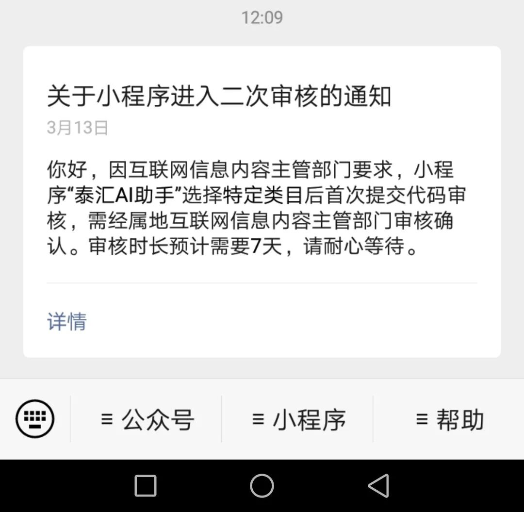 你好,经核实,你的小程序涉及首次提交社交-社区/论坛、社交-笔记_类目,进入报备流程,由网信办二次审核,如遇紧急上线等特殊情况,建议开发者自行联系省/自治区/直辖市属地网信部门,报备详情请参考:https://developers.weixin.qq.com/community/operate/doc/00002a6a0b8d98a965993666a51001