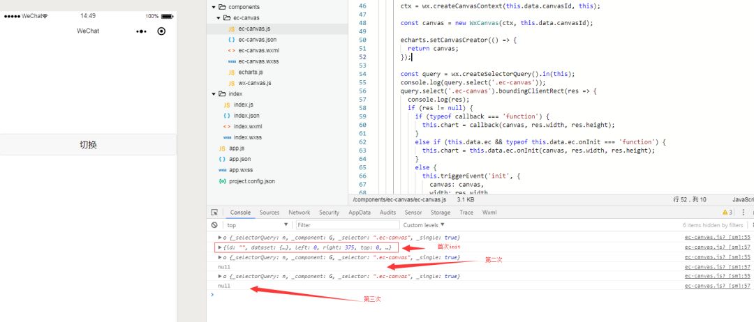 但是第二次init的时候发现boundingClientRect返回了null,打印了好几次,query和query.select('.ec-canvas')均有返回值,到boundingClientRect这就不一样了,不知道为啥