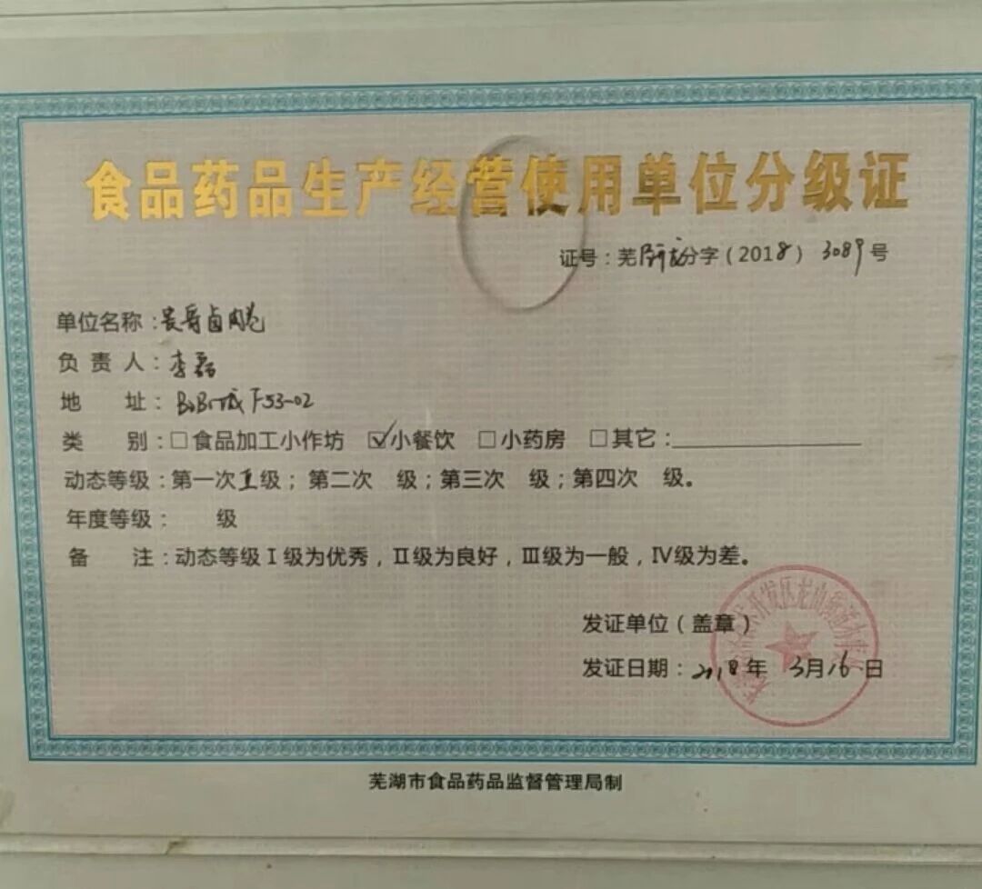 客服,麻烦你们看下,我这边的餐饮证件在相关单位办理的,芜湖市食品药品监督管理局制,当地小餐饮都是这个证件。这个证件在安徽都是得到认可的
