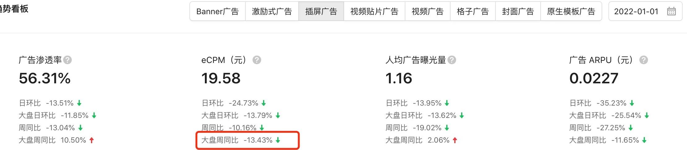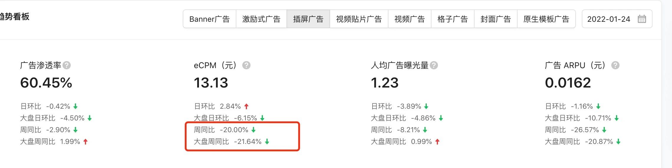 截图是 1.1日 和 1.24日的 插屏ecpm对比,从1.1号开始天天跌,持续了快一个月了。如果是流量主遇到问题至少也告知情况阿,我们的DAU数据都挺稳定,收入却一天天减少,真的是无从问起,无从查起!能不能有点做平台的责任和担当!