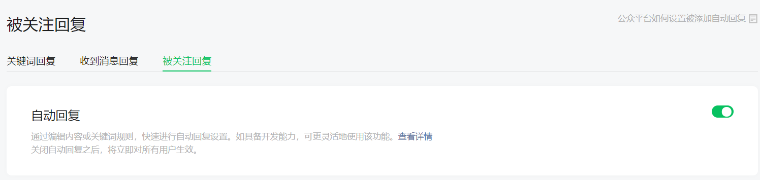 你好,你的被关注自动回复的完整界面截图给我们看看。是否有设置呢
