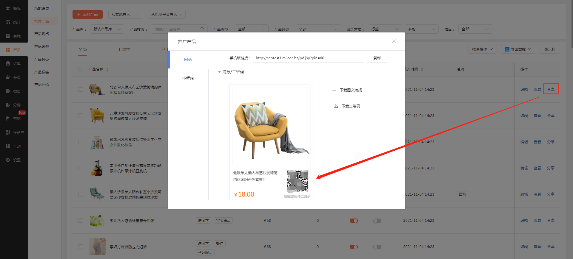 可以通过商城小程序制作平台的后台,对其商品进行分享,可以生成附带二维码的商品图文海报,用户扫码就能直接进入该商品的详情页进行购买。