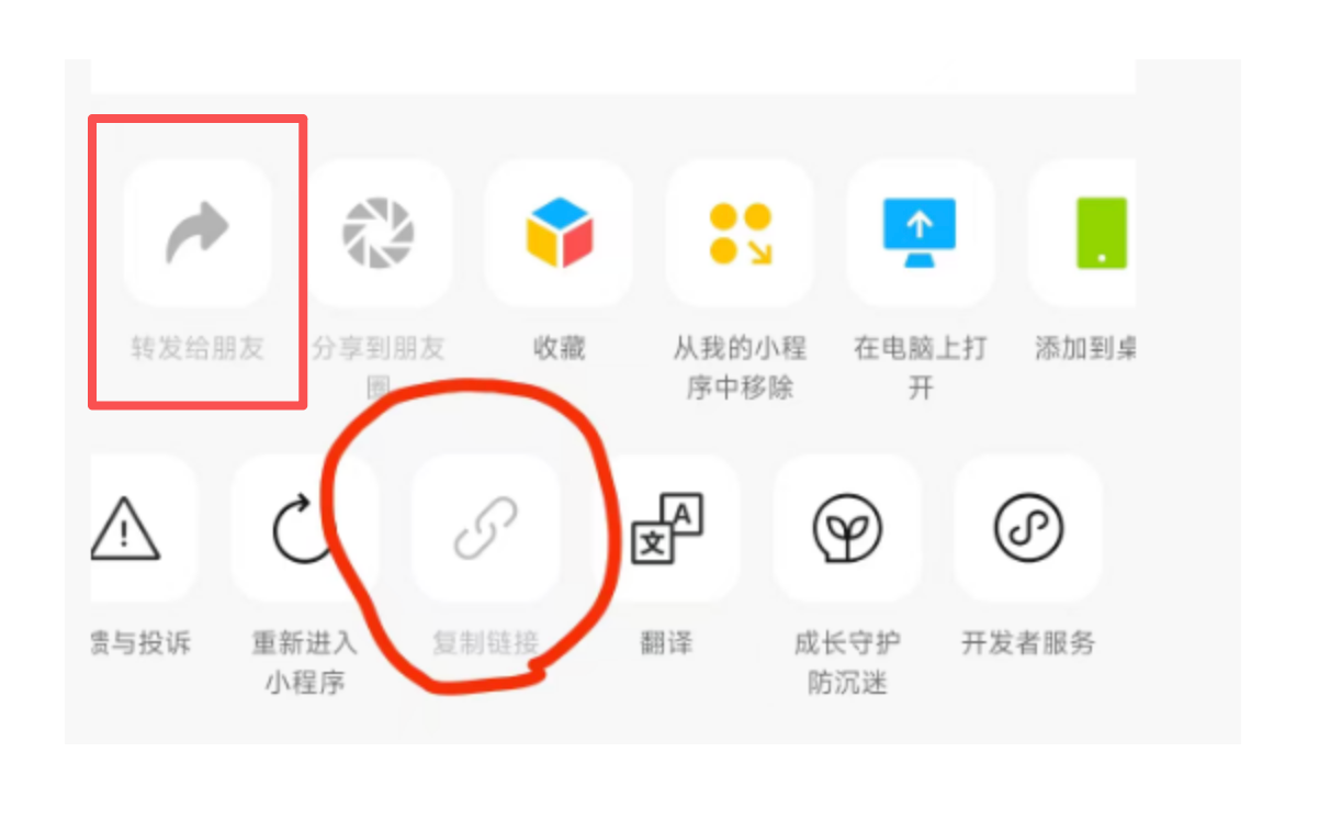 需要当前页面定义转发事件处理函数(也就是开启“转发给好友”),这个「复制链接」按钮就会启用的了。