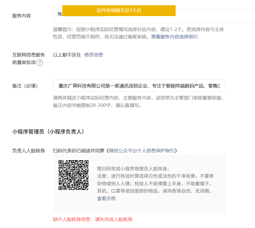 你好,请私信提供完整界面报错截图(主体负责人页面)负责人证件和营业执照、小程序APPID以便核实。