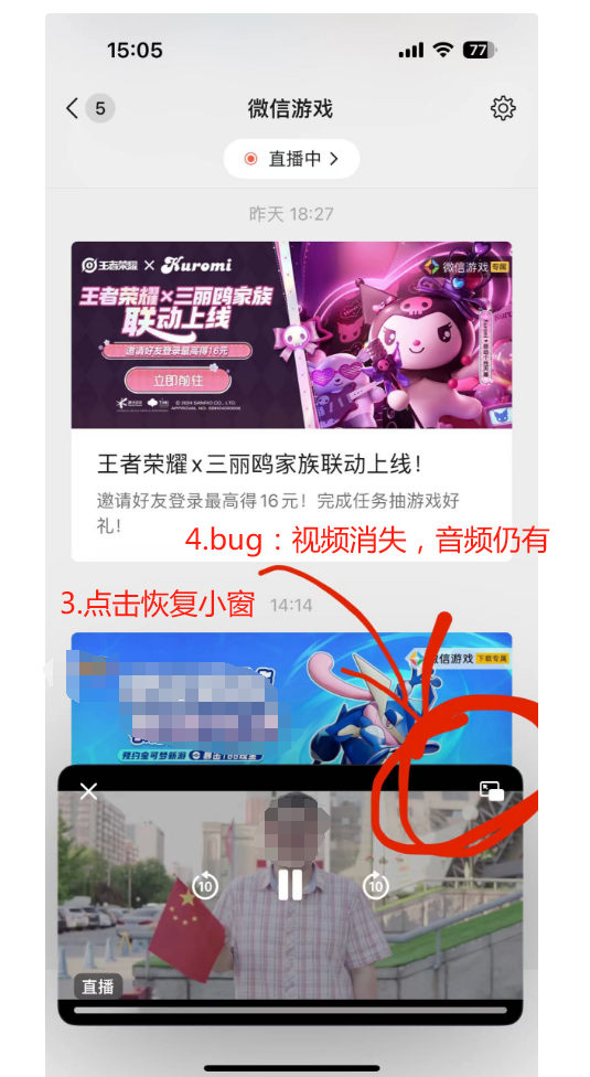 再点击小窗按钮,视频消失,音频仍再继续。--这种情况下,是否音视频同时消失,或者可以打开小程序,恢复该页面。