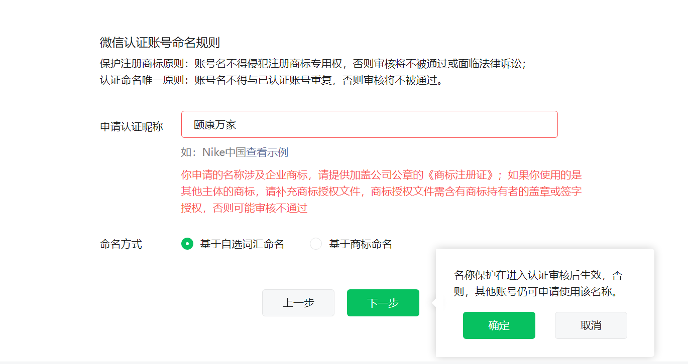 颐康万家小程序年审,在“申请认证昵称”步骤,输入小程序名称“颐康万家”,就出现提示“你申请的名称涉及企业商标,请提供加盖公司公章的《商标注册证》;如果你使用的是其他主体的商标,请补充商标授权文件,商标授权文件需含有商标持有者的盖章或签字授权,否则可能审核不通过”,但是经商标局系统查询,并无颐康万家相关商标注册。