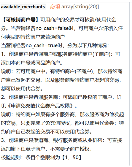 类型是免充值的时候,提示“可用商户不符合规则”,我看文档里面的“可核销商户号”第一种情况是可以传本商户号的,所以我的“归属商户号”跟“可核销商户号”传的值都是我的商户号,但是也是提示这个。。。。请求大佬们指点一二