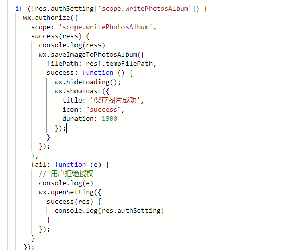 但是 最外层的 !res.authSetting['scope.writePhotosAlbum'] 就是判断是否授权, 我重新调用wx.authorize的时候 不会弹授权框 就是在手机上 第一次拒绝后 之后都会默认为拒绝操作 会反在fail中