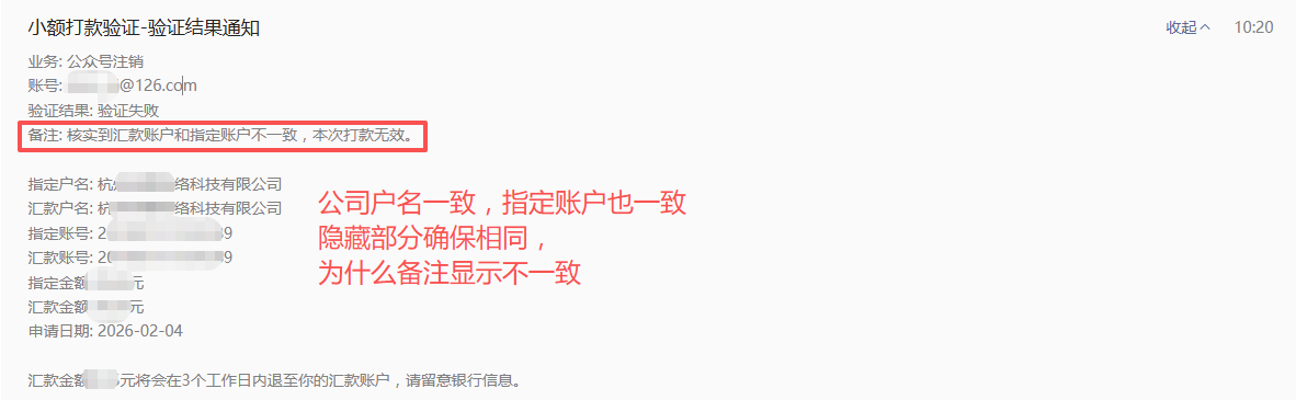 在注销公众号神辇车社会(cheshehuiweixin),使用对公账号打款验证方式时,收到验证失败信息。如下: