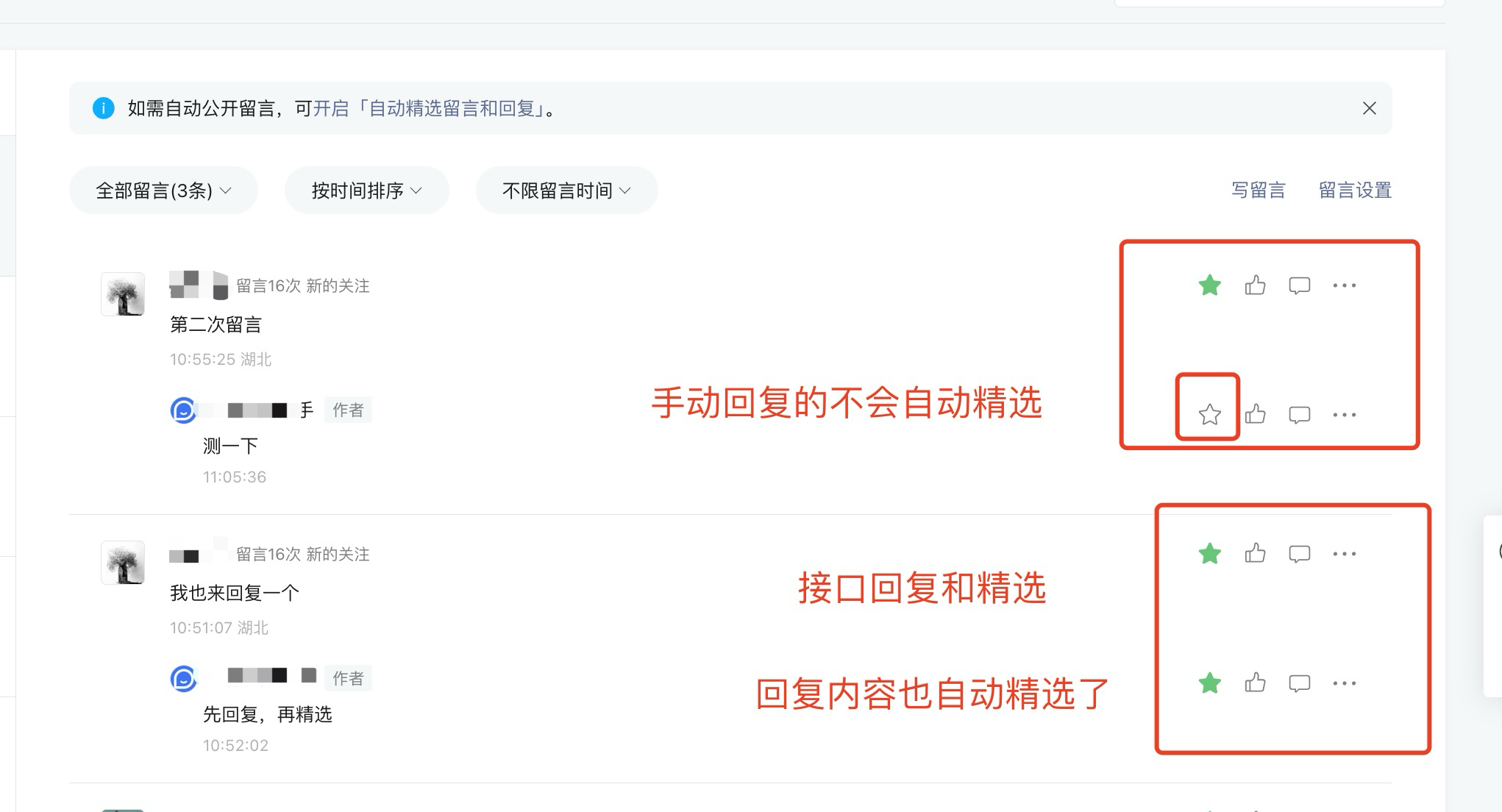 如下图所示,通过接口回复和标记的留言,回复内容也是自动标记为精选的,如果是在后台手动回复的消息,不会自动标记为精选,我的需求是留言需要精选,但是回复的内容不要标记为精选,如何实现?