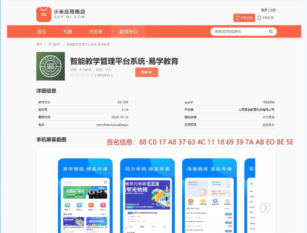 我们已经按要求提供了小米市场的应用详情页截图。截图上包含了应用名称、包名,并附上了签名信息。