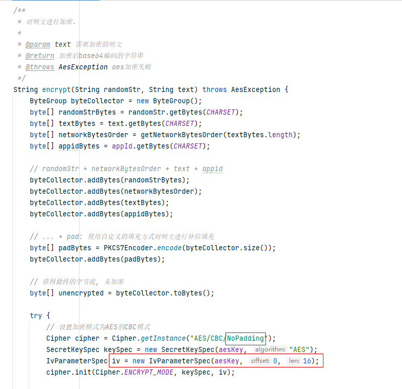 如下图,微信公众号提供的消息加解密算法,使用了NoPadding 和 固定IV,存在一定安全隐患,请问能否改进?
