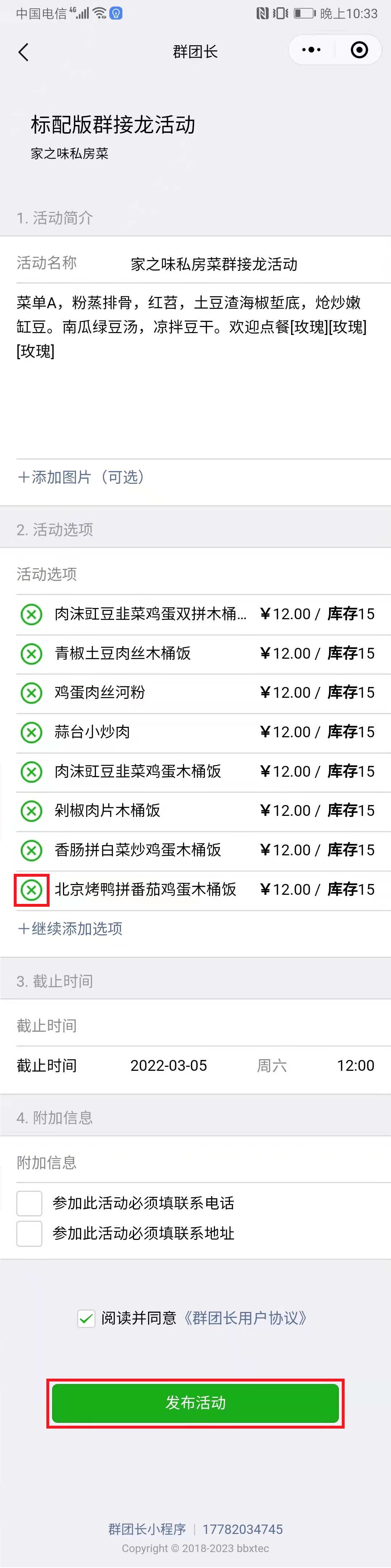 第三步,在第二部最末界面的基础上点X,删除一个选项,然后点发布活动