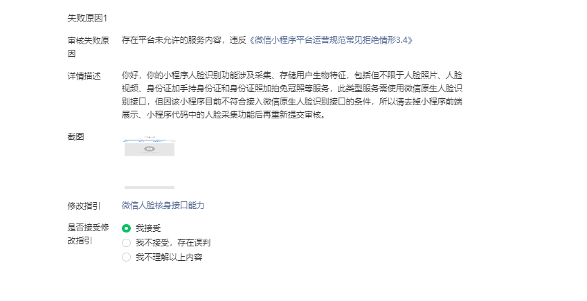 2020-06-13 16:37 提交小程序代码进行审核,审核不过的详情:小程序人脸识别功能涉及采集、存储用户生物特征,包括但不限于人脸照片、人脸视频、身份证加手持身份证和身份证照加拍免冠照等服务,此类型服务需使用微信原生人脸识别接口,但因该小程序目前不符合接入微信原生人脸识别接口的条件,所以请去掉小程序前端展示、小程序代码中的人脸采集功能后再重新提交审核。