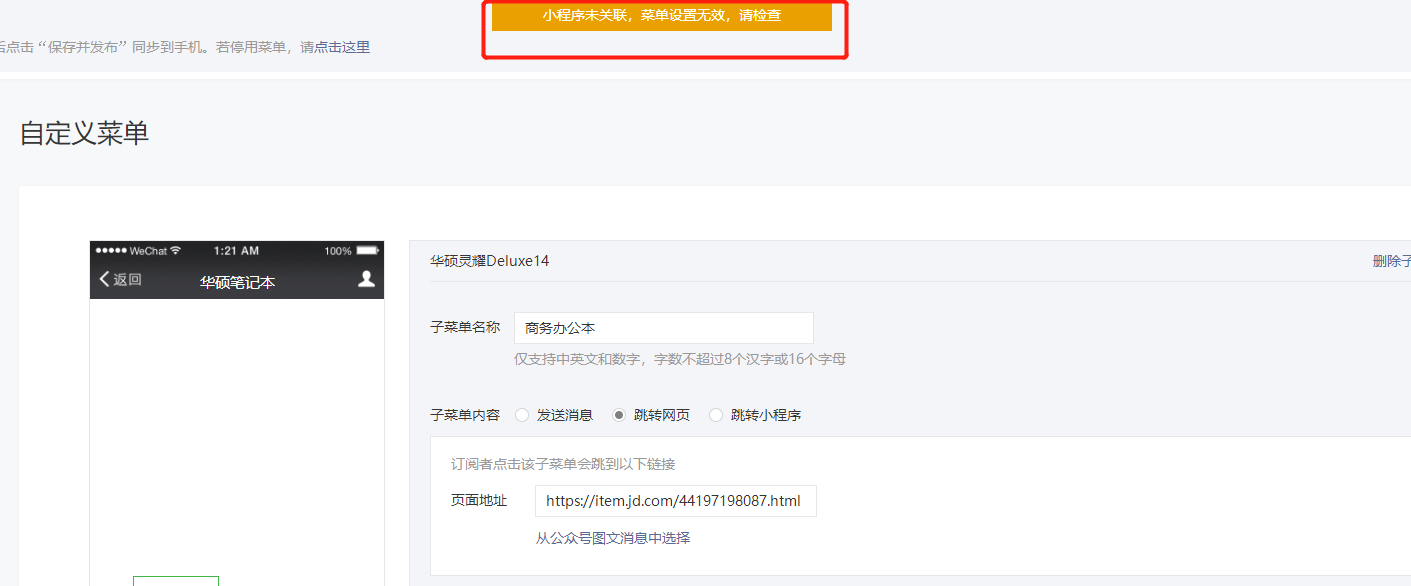 并不是插入小程序呀,就是改一下跳转链接,为什么一直提示提示小程序未关联菜单设置无效请检查?人工客服也打不进去电话,能给解答一下吗?