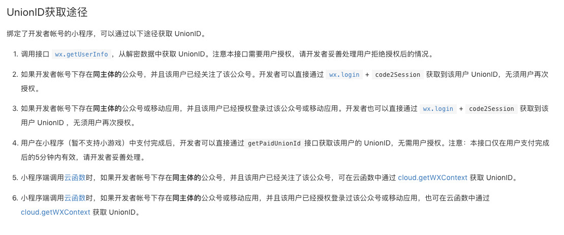 我用wx.login获取到jscode后,用code2sesion获取用户的unionid,大部分用户都能正常获取,可是遇到少部分用户获取不到unionid,经调查,这些用户都关注过公众号,他们是通过扫描二维码后,先关注的公众号,然后再打开的小程序,可是却获取不到unionid,看官方文档说这种情况应该是可以直接获取到unionid的,求解,下面附上官方文档,第2条,用户是符合这种情况的