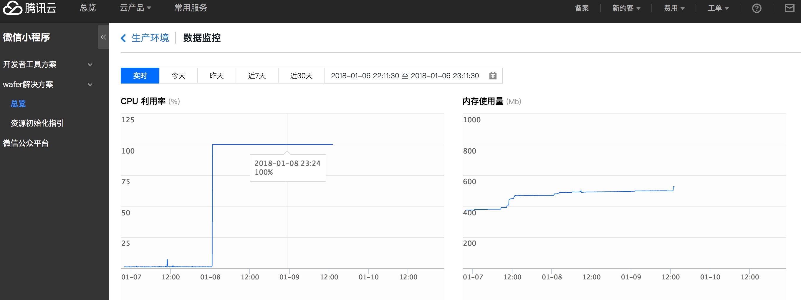 腾讯云提供的免费生产环境,开通后部署成功,也可以使用,昨天突然出现phpmyadmin返回gateway错误,连不上,直接从浏览器调用API能看到空返回,今天登陆腾讯云后台,发现CPU从1月8号凌晨起一直100%,可是现在才1月7号呀。现在这个免费的生产环境根本连不上,求帮助