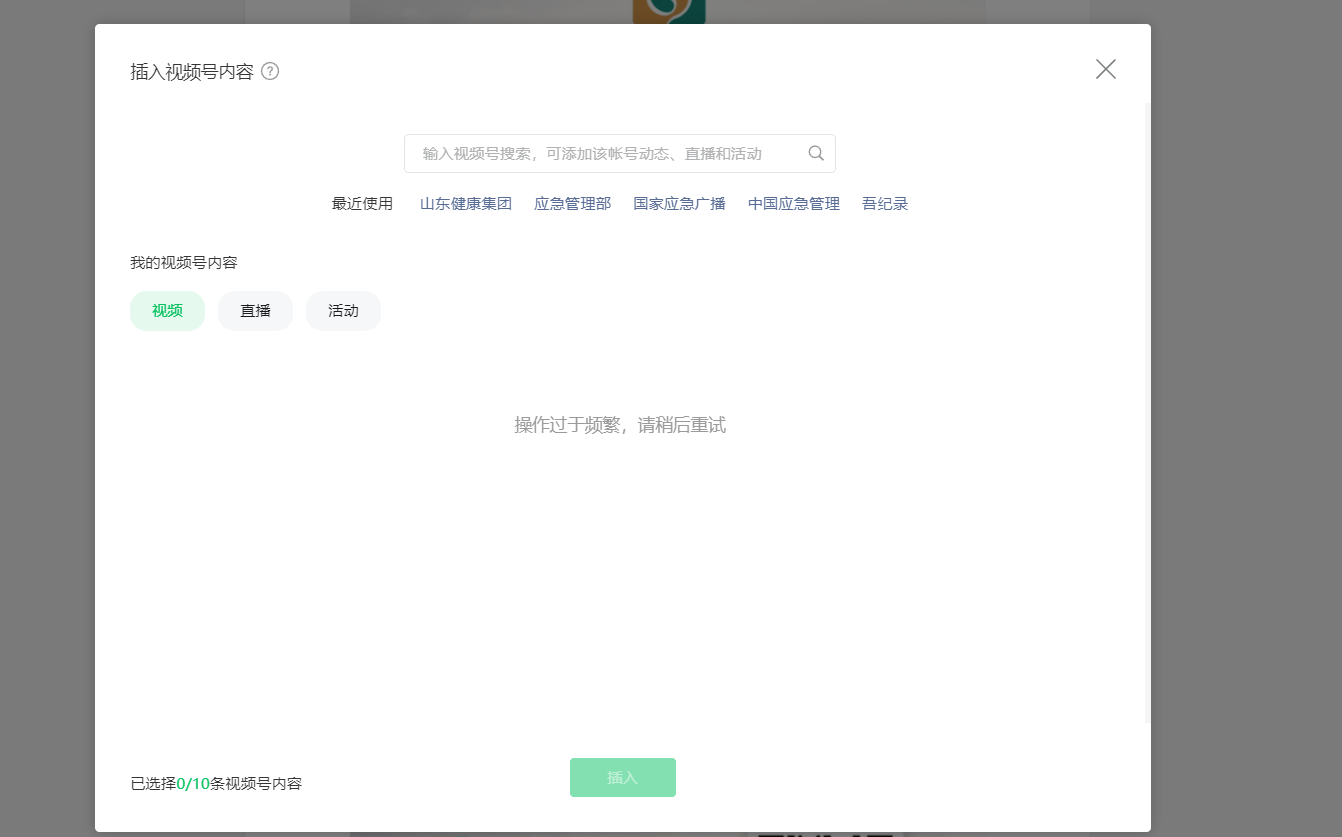 你好,我从昨天下午成功上传了视频号内容后,想要在公众号发布文章中添加视频号内容,可是明明已经上传成功的视频号就迟迟刷新不出来,导致添加不上,然后再操作就显示我操作过于频繁,请稍后再试。目前已经过去15个小时候,依旧显示操作过于频繁,请稍后再试,请问怎么回事?