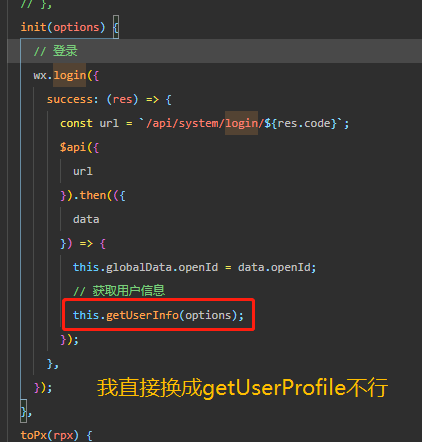 哪位大神告诉下在我的代码里,怎么才能替换成getUserProfile使用啊,我直接替换不行