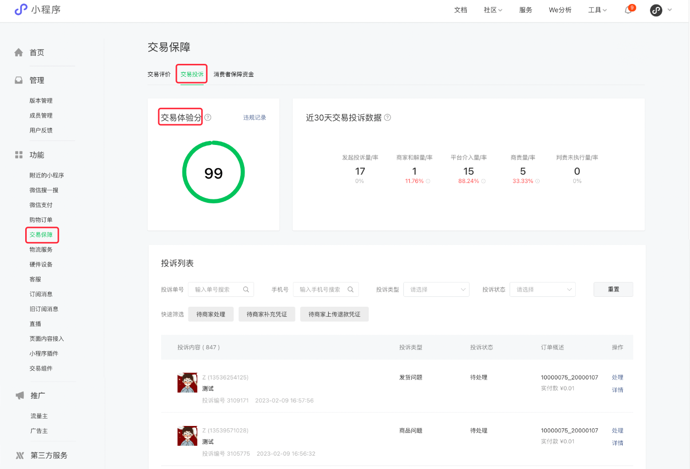 登录小程序管理后台—功能—交易保障—交易投诉—交易体验分查看当前小程序交易体验分,点击违规记录可查询具体扣分记录与处理记录。