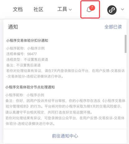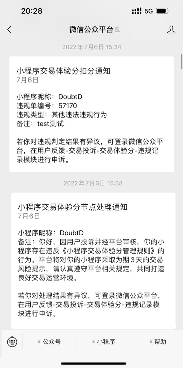 1、为便于小程序开发者及时获知交易体验分扣分及违规处理措施下发情况,平台每次扣分/下发违规处理措施都会通过小程序管理后台站内信以及公众号「微信公众平台」下发给小程序成员(包括管理员/运营者/开发者/数据分析者)。