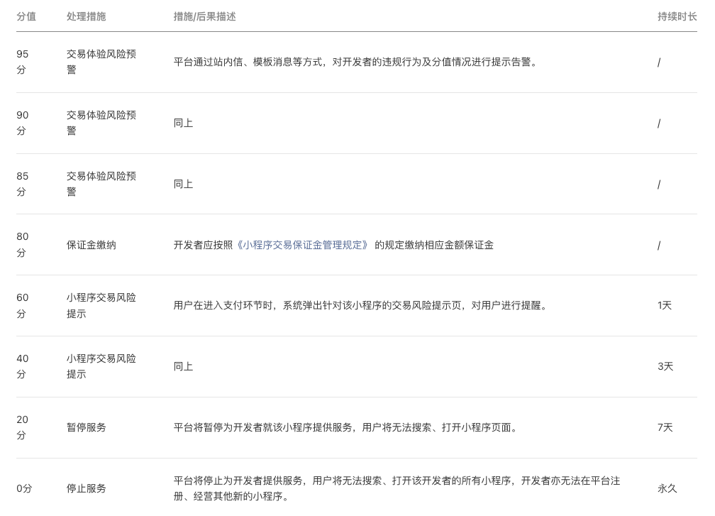 当小程序的交易体验分被平台扣减至(等于或小于)如下分值节点,平台将对该开发者采取相应节点的处理措施。