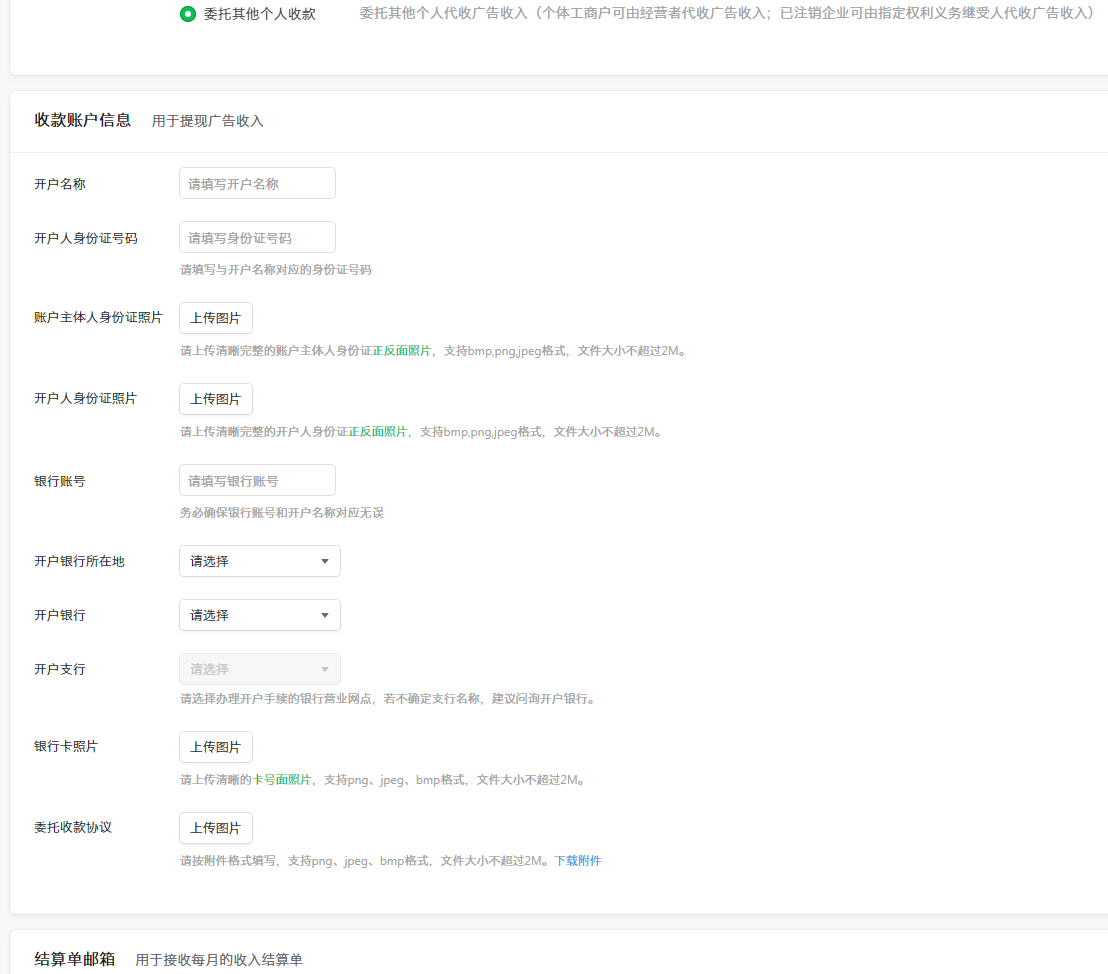 个人公众号委托其他个人收款怎么填写的开户名称,开户人身份证写谁的?账户主体身份证照片是谁的?包括银行卡号写谁的?还有委托协议书上的银行账户,账号写谁的,还有那个结算单邮箱有绑定限制吗?没有弄过,麻烦告知详细,谢谢!