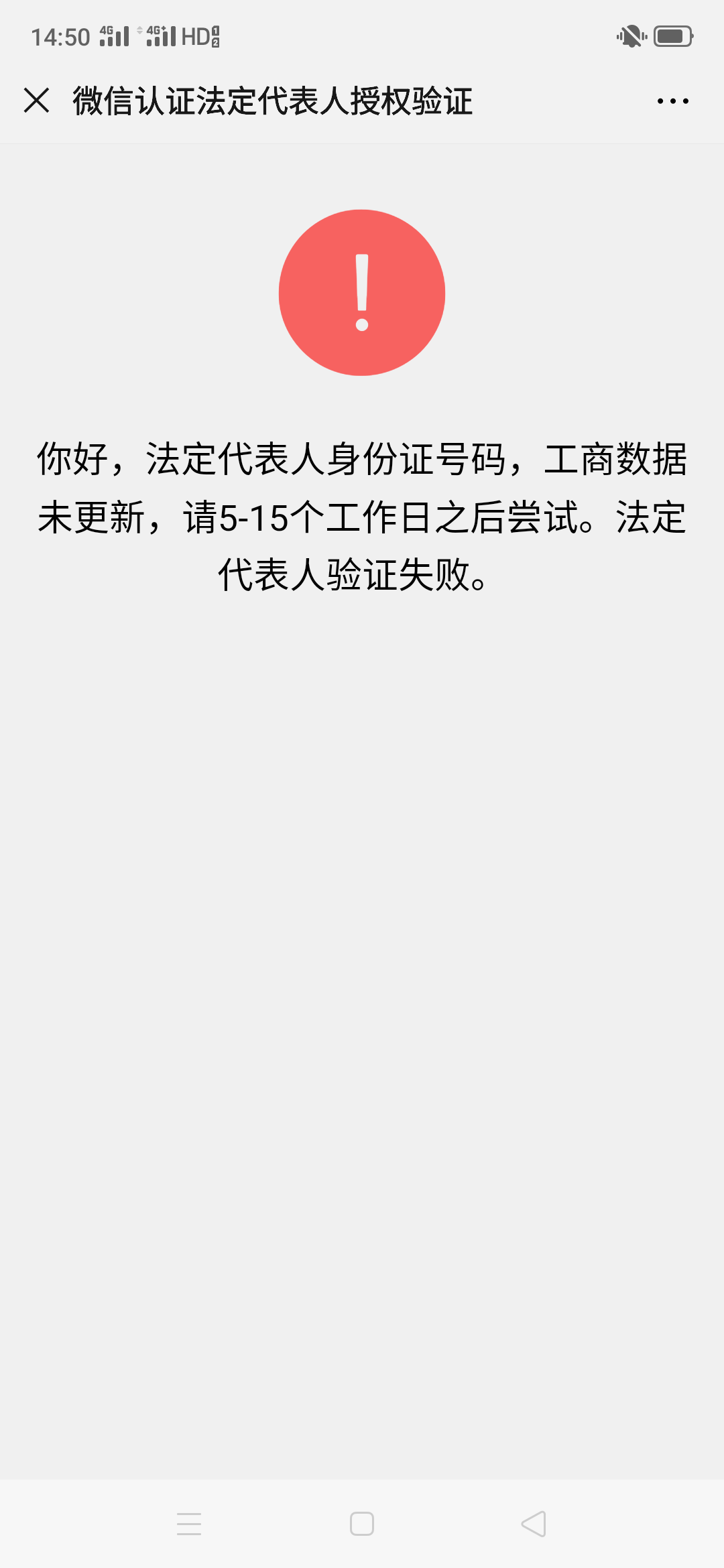 最近个体工商户申请的小程序主体,认证的时候会出现:法定代表人身份证号码,工商数据未更新,请5-15个工作日之后尝试,这是怎么回事,工商局那边也找过了,没问题,认证时候名字也检查过了,全部能核对上,为了找到问题所在,同时用三个个体主体注册了小程序,可认证的时候,结果都是一样,这是为什么啊,自微信小程序上线了人脸识别认证后,这问题就出来了,之前打款认证,很快就能申请下来,求官方找到解决的途径,急急急...