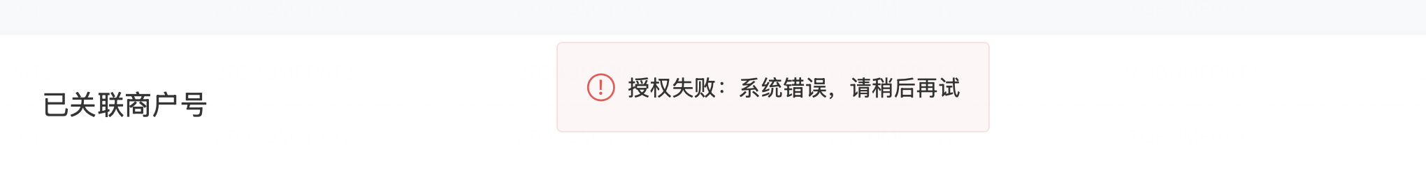 对于目前已关联的商户号,在执行授权时出现“授权失败”的提示: