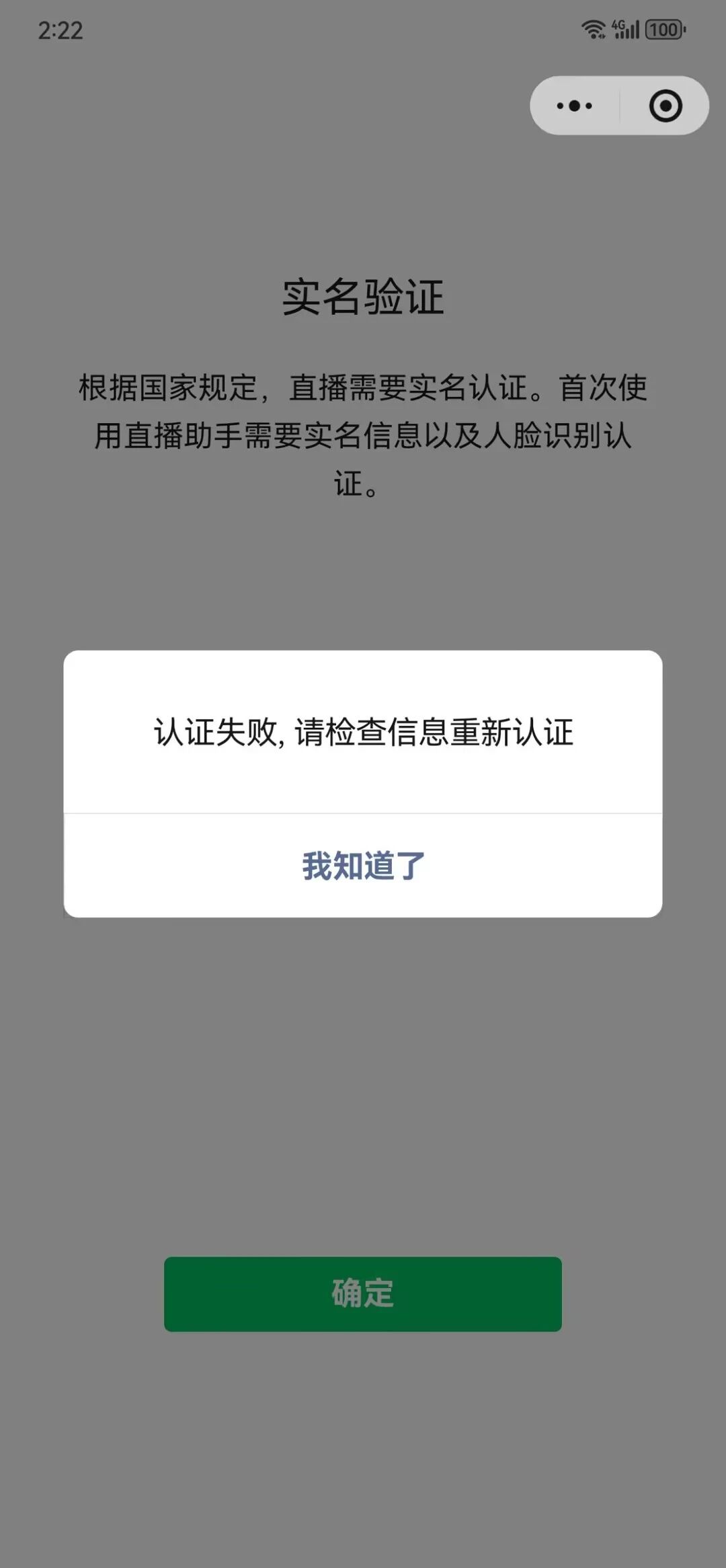 这个问题至少两周了,认证一直提示“认证失败”,就是官方的认证系统出问题了,小程序直播用的人少了,根本没人管。