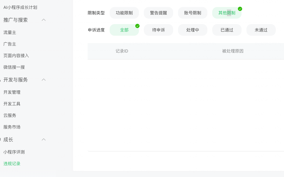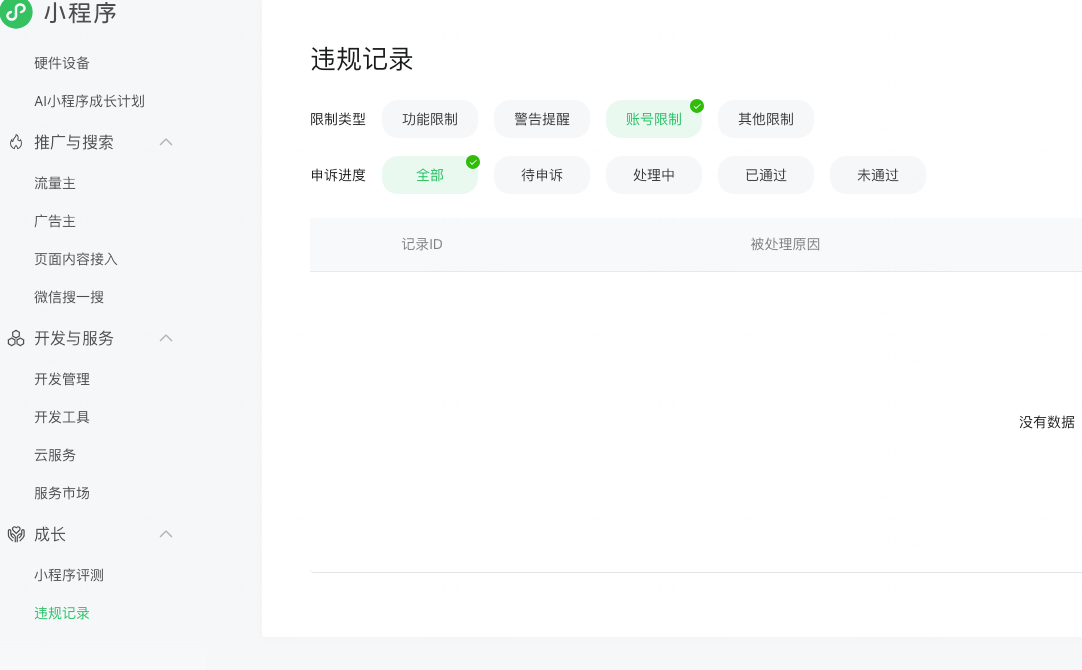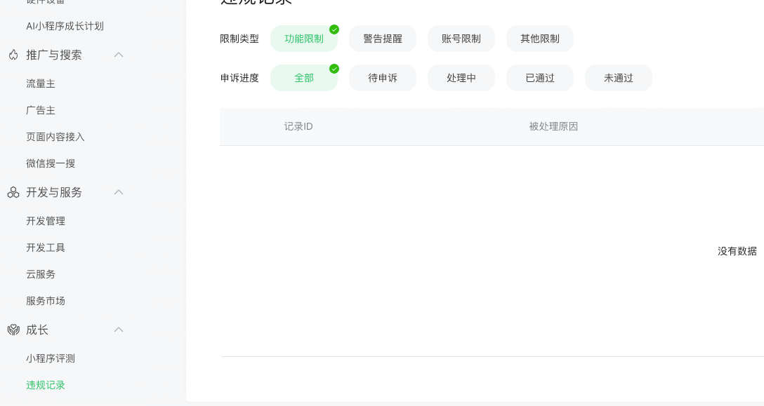 小程序搜索功能被限制,说小程序涉嫌违规,但在违规记录里又查不到任何违规记录,要怎么处理?
