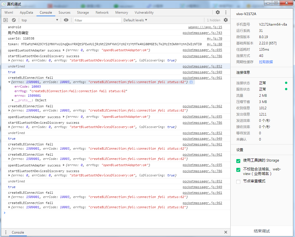 环境:vivo iQOO 9 Pro 型号:v2172A 使用蓝牙连接时 报错 createBLEConnection fail