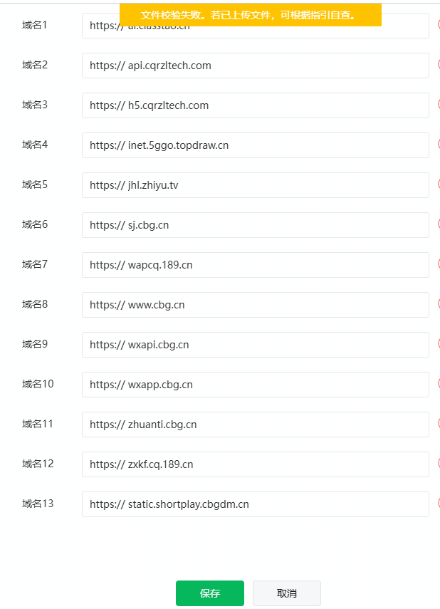去除最后一个域名时可成功保存,最后一个域名下校验文件直接访问可访问到,校验文件为后台下载后直接上传,未经过修改