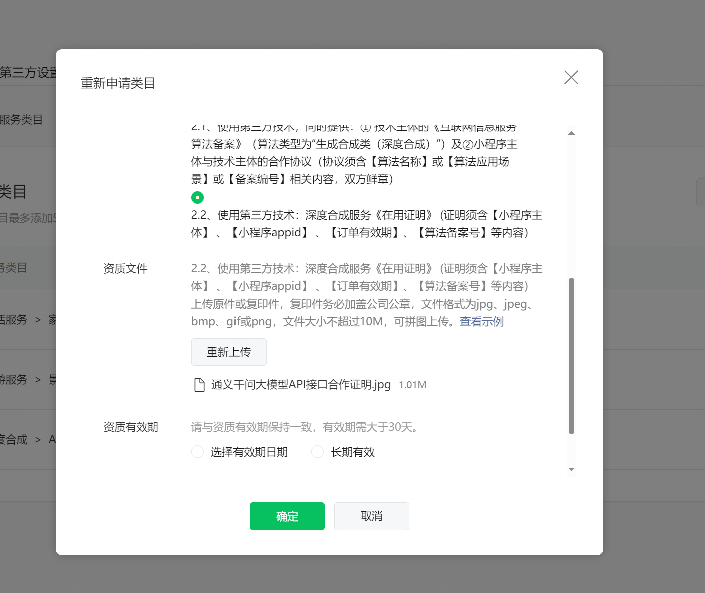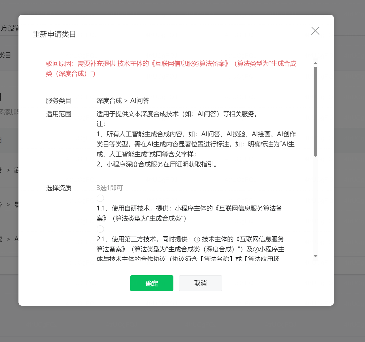 你好,经核实,小程序申请【深度合成-AI问答】类目,提供的是小程序主体与其他技术主体的协议,非在用证明,故需补充提供技术主体的《互联网信息服务算法备案》(算法类型为“生成合成类(深度合成)”)。