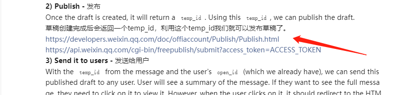 temp_idfrom the message and the user'sopen_id(which we already have), we can send this published draft to any user. User will see a summary of the message. If they want to see the full message, they need to click on it to view it. However, when the user clicks on it, it should redirect to the HTML content we set in stage 1 (which was uploaded to WeChat). Instead, it currently redirects to a 'Temporary link unavailable' page.利用消息中的 temp_id 和用户的 open_id(我们已经有了),我们可以将这个已发布的草稿发送给任何用户。用户将看到消息摘要。如果他们想查看完整消息,他们需要点击它来查看。但是,当用户点击它时,它应该重定向到我们在第 1 阶段设置的 HTML 内容(已上传到微信)。相反,它当前重定向到“临时链接不可用”页面。https://developers.weixin.qq.com/doc/offiaccount/en/Message_Management/Service_Center_messages.html#7