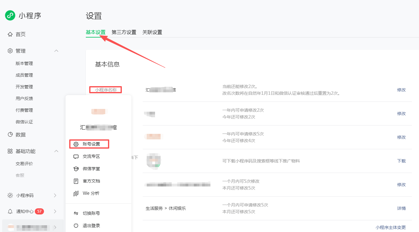 2、小程序名称:【账号设置】→【基本信息】页面→ 【小程序名称】