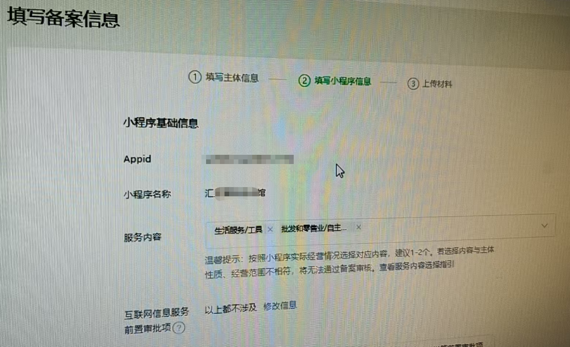 2)备案流程中【小程序基础信息】-【小程序名称】系统会获取当前实际小程序名称,并非是原备案信息小程序名称,建议可根据上述步骤进行排查