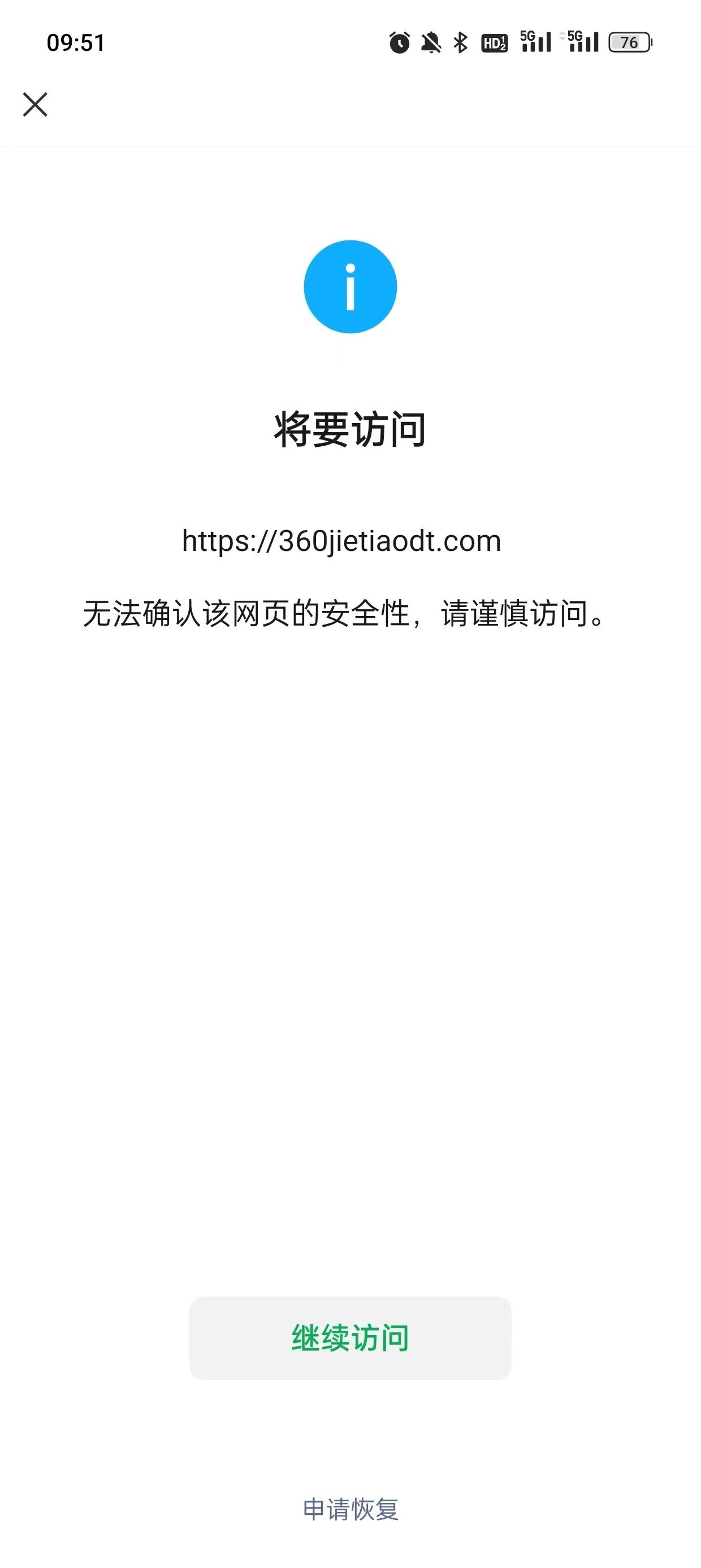 点击【继续访问】是否可以正常访问内容。可以的话重新访问点击【申请恢复】,等待审核通过。