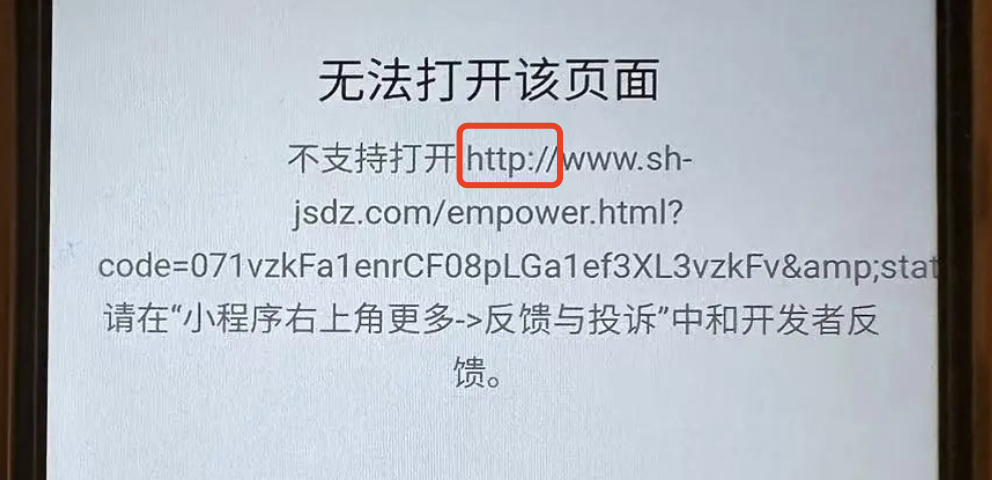 你看下小程序里面的授权链接是不是重定向到https?看你发帖截图来看是重定向到http了,所以打不开。