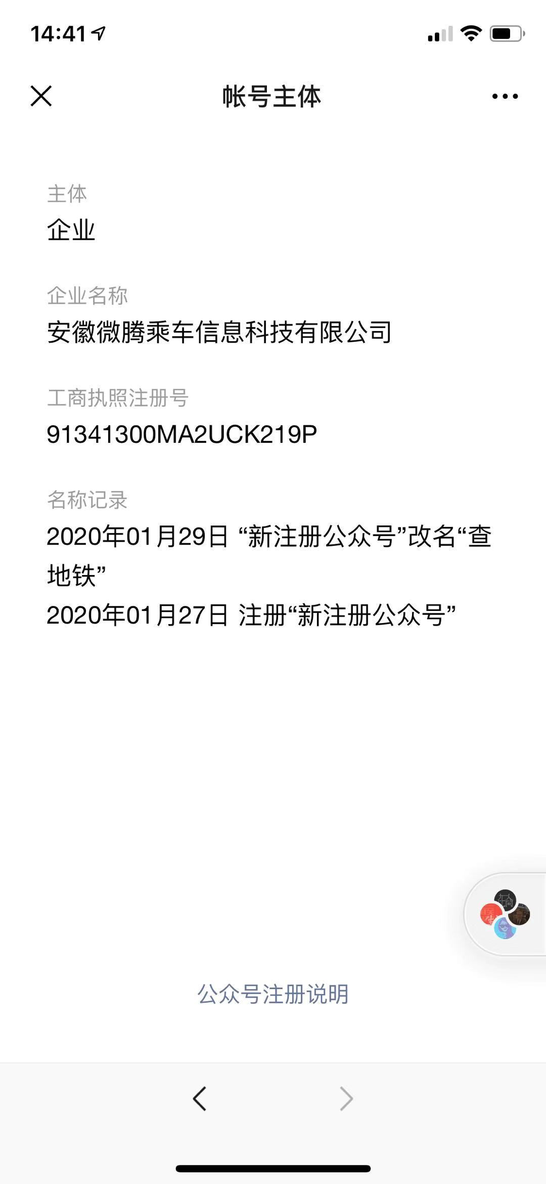“查地铁”这个名称是我们最早注册的,我也查过商标,没有任何团队注册了这个商标,不清楚为何存在混淆误认一说。而且是刚刚好在年前1月20日被告知的,提交申诉后由于新年休假至今未处理,现在名称可能过了保护期,名称已经于1月29日被其他公众号注册了(见图2),我们的期望很简单,就是复原我们的昵称。
